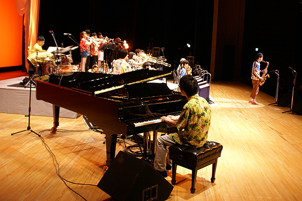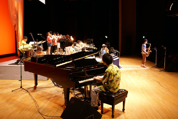 - モダンなサウンドが魅力。「みんなが力んでいないいい演奏。ソプラノソロは音楽的。ピアノとドラムが会話していた。アルトソロは粒が揃い、表情があってよかった」と角田健一氏。