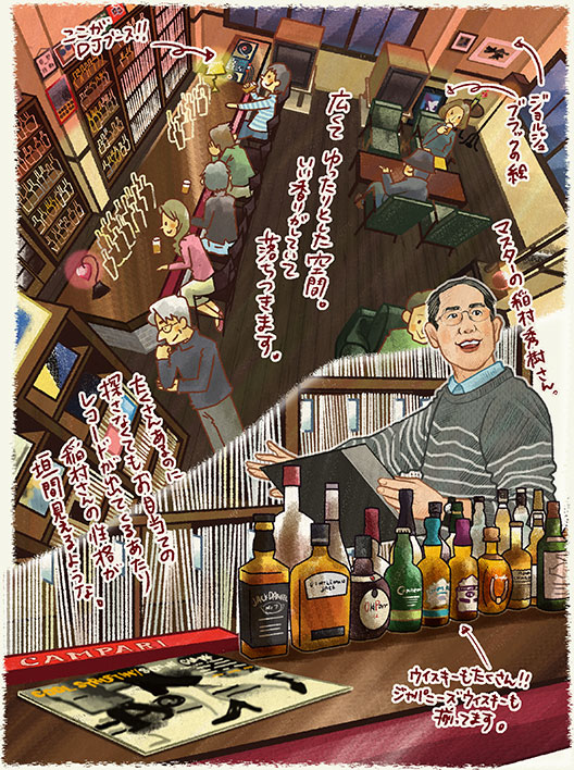 シングルモルトやベルギービールなどお酒も豊富な種類が取り揃えられており、お酒好きのツボを刺激してくれます。そして、あらゆるジャンルの詰まったレコードコレクションから稲村さんによる絶妙の選曲選盤で、きっとあなたの音楽の“ツボ”も大いに刺激される事でしょう。