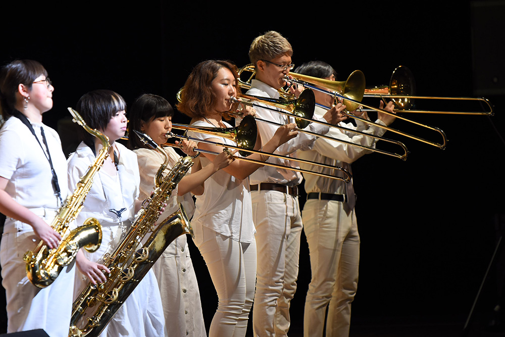 伊藤「毎年決まった演奏機会は夏の山野BBJCだったり、1月のリサイタルだったり、これは音楽大学特有なのですが、8月に音楽大学の学バンが集まって一緒にライブをやる Jazz Conservatory という企画があります。洗足音楽大学さん、国立音楽大学さんのバンドと一緒に演奏します。また、大学の学祭で演奏しているのに加えて、Student Jazz Festivalという、山野の高校生版のような大会にゲストとして出演させていただいています。エリック・ミヤシロ先生や本田雅人先生とコラボして演奏させていただいたこともあります。」